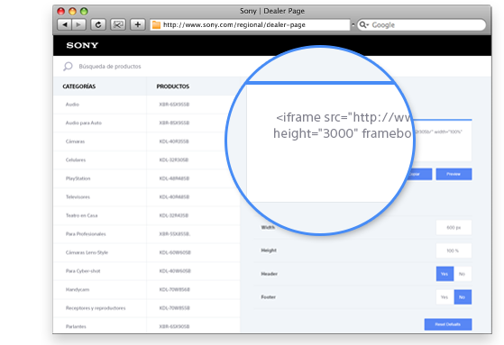 <iframe src='http://dev.m8agency.com/sony/2014/syndication/view/index.html?product="product"&width=100%&height=3000px&header=yes&footer=yes' width='100%' height="0" frameborder='0' scrolling='no'></iframe>;